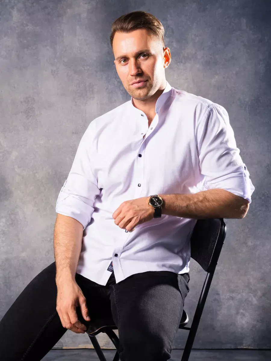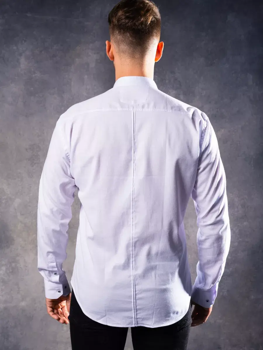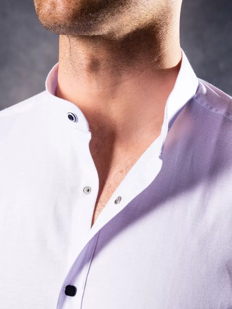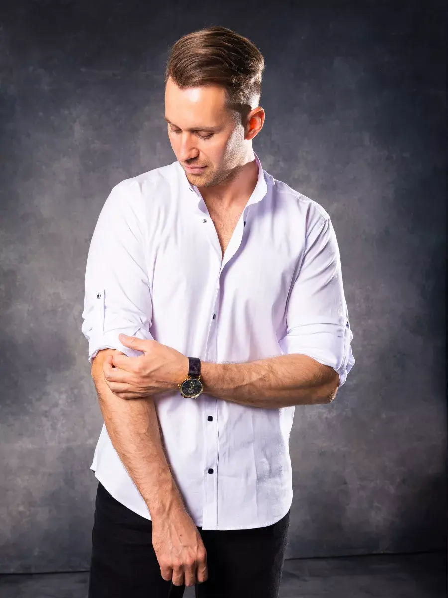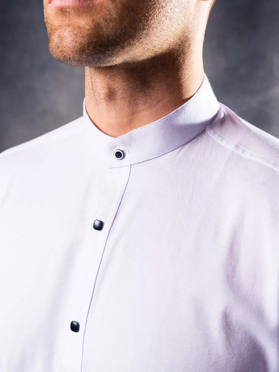 Рубашка мужская без воротника с длинным рукавом на кнопках должна обязательно появится в гардеробе каждого мужчины или парня. Тренд сезона 2025. Приталенная модель подчеркивает фигуру и добавляет элегантности образу. Дизайн не предусматривает лишних деталей, что идеально для походитв офис мужчине на каждый день и подростку в школу на школьный выпускной, а также на свадьбу. Плотные манжеты на кнопке. Длина рукава регулируется, за счет подворота и пуговицы. Слегка удлиненный фасон позволяет носить сорочку заправленной и навыпуск. Приталенный крой мужских рубашек и строгий воротник стойка, который застегивается на пуговицу делает ее отличным дополнением к гардеробу как для высоких так и невысоких мужчин, а так же для мужчин, активно занимающихся спортом.